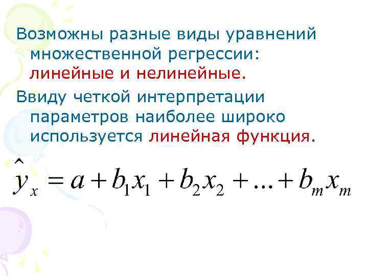 Возможны разные виды уравнений множественной регрессии: линейные и нелинейные. Ввиду четкой интерпретации параметров наиболее широко используется линейная функция.