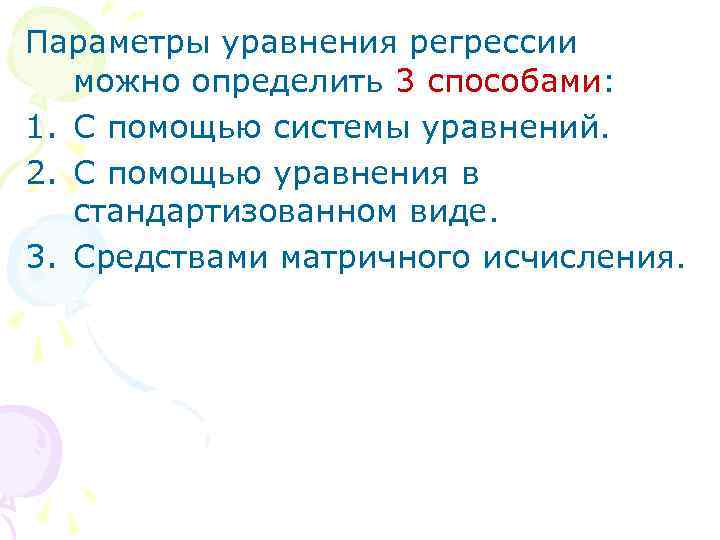 Параметры уравнения регрессии можно определить 3 способами: 1. С помощью системы уравнений. 2. С помощью уравнения в стандартизованном виде. 3. Средствами матричного исчисления.
