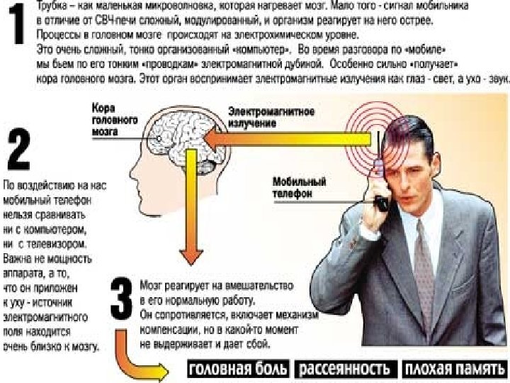 . . . дети тормозят. . . Алан Прис, глава отделения биофизики Бристольского онкологического центра, на полчаса дал телефоны ребятам 10 - 11 лет. У половины они работали в режиме разговора, у других были отключены. А потом ученый провел нейрофизиологические тесты. У тех, кому достались включенные мобильники, все реакции оказались замедленными. Другой эксперимент показал, что даже после двухминутной беседы у подростков 11 13 лет меняется биоэлектрическая активность мозга. В норму она приходит лишь через два часа. Что это значит? У ребенка меняется настроение, он хуже воспринимает материал на уроке, если во время переменки болтал по сотовому.