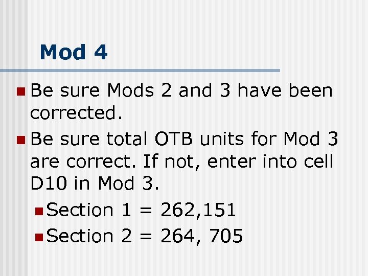 Mod 4 n Be sure Mods 2 and 3 have been corrected. n Be sure total OTB units for Mod 3 are correct. If not, enter into cell D 10 in Mod 3. n Section 1 = 262, 151 n Section 2 = 264, 705