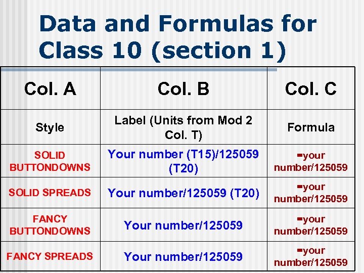 Data and Formulas for Class 10 (section 1) Col. A Col. B Col. C Style Label (Units from Mod 2 Col. T) Formula SOLID BUTTONDOWNS Your number (T 15)/125059 (T 20) =your number/125059 SOLID SPREADS Your number/125059 (T 20) =your number/125059 FANCY BUTTONDOWNS Your number/125059 =your number/125059 FANCY SPREADS Your number/125059 =your number/125059