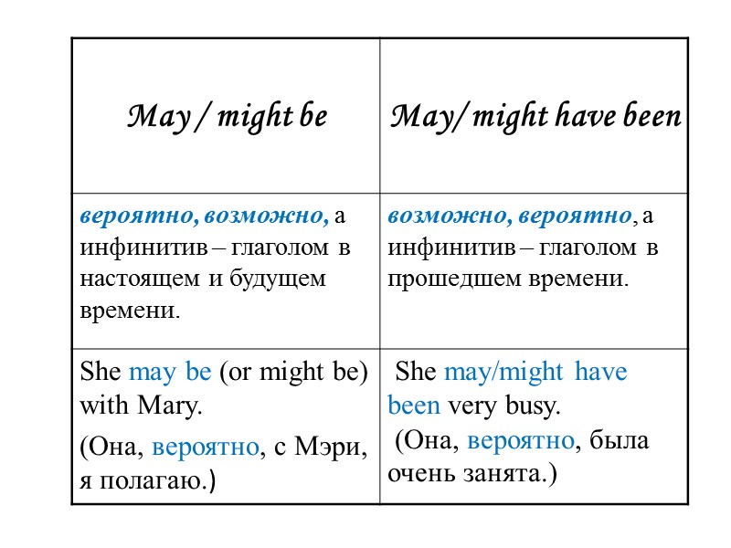 May/ might have been May and might can be used with the Perfect Infinitive when we say what was possible in the past. Употребляется для выражения предположения, относящегося к прошлому. Переводится : возможно, вероятно, а инфинитив – глаголом в прошедшем времени. She may/might have been very busy. Она, вероятно, была очень занята.