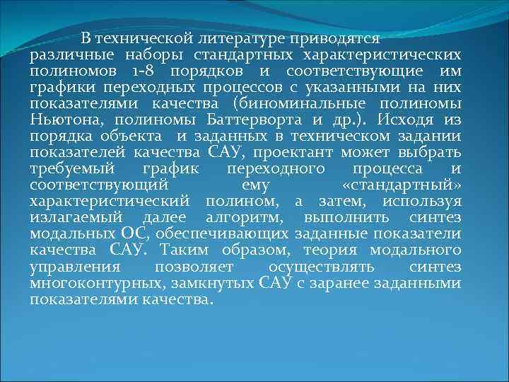 В технической литературе приводятся различные наборы стандартных характеристических полиномов 1 -8 порядков и соответствующие им графики переходных процессов с указанными на них показателями качества (биноминальные полиномы Ньютона, полиномы Баттерворта и др. ). Исходя из порядка объекта и заданных в техническом задании показателей качества САУ, проектант может выбрать требуемый график переходного процесса и соответствующий ему «стандартный» характеристический полином, а затем, используя излагаемый далее алгоритм, выполнить синтез модальных ОС, обеспечивающих заданные показатели качества САУ. Таким образом, теория модального управления позволяет осуществлять синтез многоконтурных, замкнутых САУ с заранее заданными показателями качества.