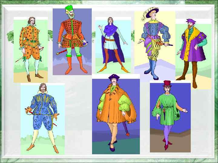 Frühe Renaissance 1449 -1525, Italien • • Die frühen Renaissancejahre blieben noch bei den oben engen und hochtaillierten Kleidern mit weiten Röcken. Dazu trugen die Frauen eine kleine Kappe. Auch bei den Männern wurden nun die Röcke weiter, blieben aber kurz. In der ersten Hälfte des 16. Jahrhunderts wurden Ärmel und Beinbekleidungen gepufft und geschlitzt. Bei der Männerbekleidung trat das Hemd sichtbar in den Vordergrund. Wams, Schaube, Pluderhose, die sogenannten "Bärenfüße" als Schuhform und als Kopfbedeckung das Barett beschreiben die Mode des Herrn