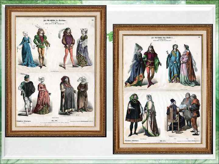 Romanische und gotische Mode 1300 -1390 • Mit dem zunehmenden Marienkult ließen auch Männer und Frauen ihre Haare wachsen. Die Gewänder fielen leicht fließend bis zum Boden herab. Der lange Rock wurde vorn oder seitlich geschlitzt, um beim Reiten nicht zu behindern. Darunter trug man Beinlinge, die an einem Leinenhemd befestigt wurden