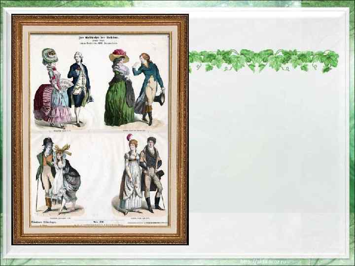Rokoko: Um 1730 bis 1770 • Schon seit 1719 kam der Reifrock in Mode. Wespentaille und ein tiefer eckiger oder runder Ausschnitt zeigten ein hohes Dekolleté. Die Halbärmel wurden am Rand mit Spitzenvolants verziert. Die Frisur benötigte Schläfen- und Ringellocken. Am Fuß zierten Stöckelschuhe ihre Trägerin
