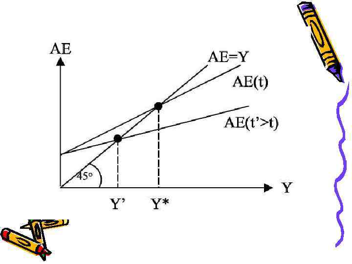 Изменение ставки подоходного налога не оказывает влияния на автономные расходы, а изменяет величину мультипликатора. Рост ставки подоходного налога ведет к уменьшению мультипликатора и снижению равновесного выпуска. Геометрически это означает уменьшение угла наклона кривой совокупного спроса.