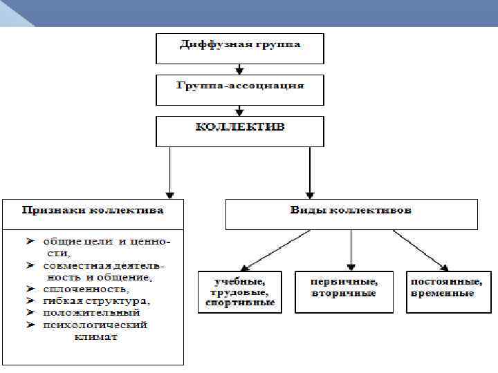 Типы и структура коллектива Первичные коллективы — это коллективы, в которых наблюдается непосредственный межличностный контакт между его членами. Вторичный коллектив — более сложный по своему составу — состоит из ряда первичных коллективов, разнообразных по характеру деятельности, интересам, содержанию общения, составу (кружки, звенья, ансамбли, студии, отряды, бригады, команды) По содержанию деятельности - учебными, трудовыми, научными, общественно-политическими, художественно-творческими, клубными, спортивными и др. По заданной функции: производственными, воспитательными (детский и педагогический коллективы учебно-воспитательных учреждений). По социально фиксированному положению: формальные (юридически фиксированный статус, социально заданная деятельность); неформальные (добровольные объединения по интересам, симпатиям и др. ) По длительности функционирования: постоянные, временные (коллектив летнего оздоровительного лагеря, бригады и т. п. ), ситуативные (сводные отряды для выполнения определенной задачи, группы творческого дела в КТД и др. ).