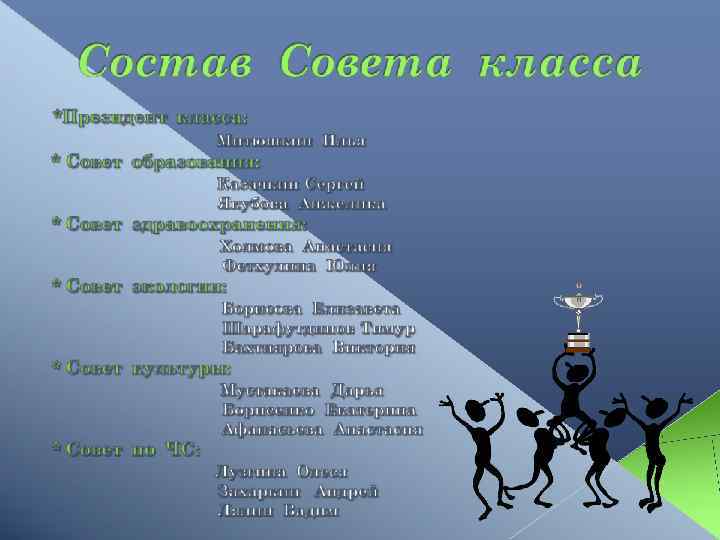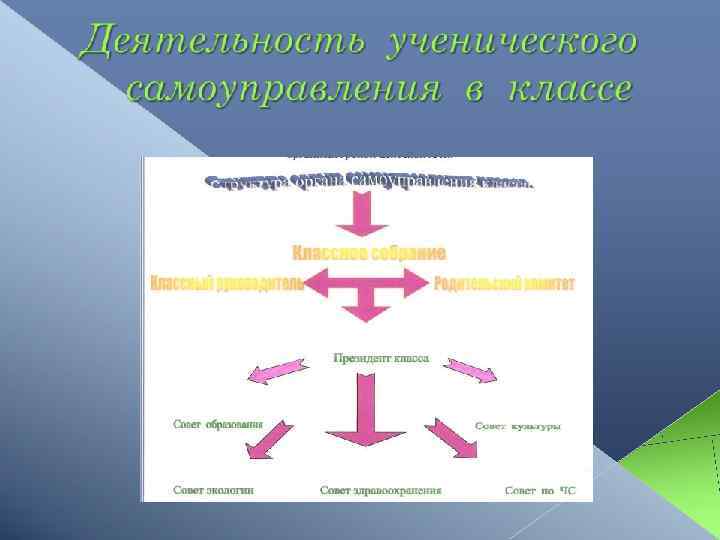 Совет образования * Осуществлять контроль за готовностью учащихся класса к занятиям; *Оказывать методическую помощь учащимся. Совет здравоохранения * Проводить утреннюю гимнастику; * Контролировать соблюдение правил личной гигиены. Совет экологии * Осуществлять уход за комнатными растениями в классе; * Следить за чистотой в кабинете; * Составлять график дежурства учащихся в классе; * Контролировать работу во время трудового десанта. Совет культуры * Оказывать помощь при подготовке и организации мероприятий; * Осуществлять контроль за культурой поведения в столовой; * Составление графика дежурства учащихся по столовой. Совет по ЧС * Следить за соблюдением порядка в классе; * Разрешать конфликтные ситуации.