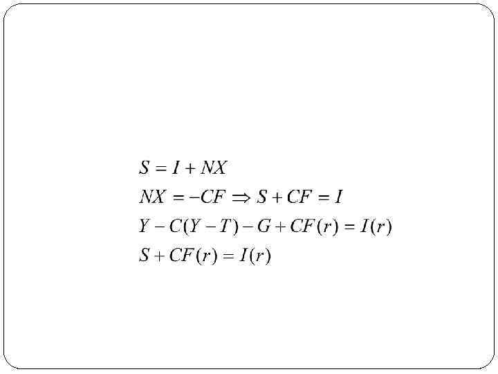 Модель большой открытой экономики Y=C+II+G+NX C=C(Y+T) NX=NX(e) I=I(r) CF=CF(r)