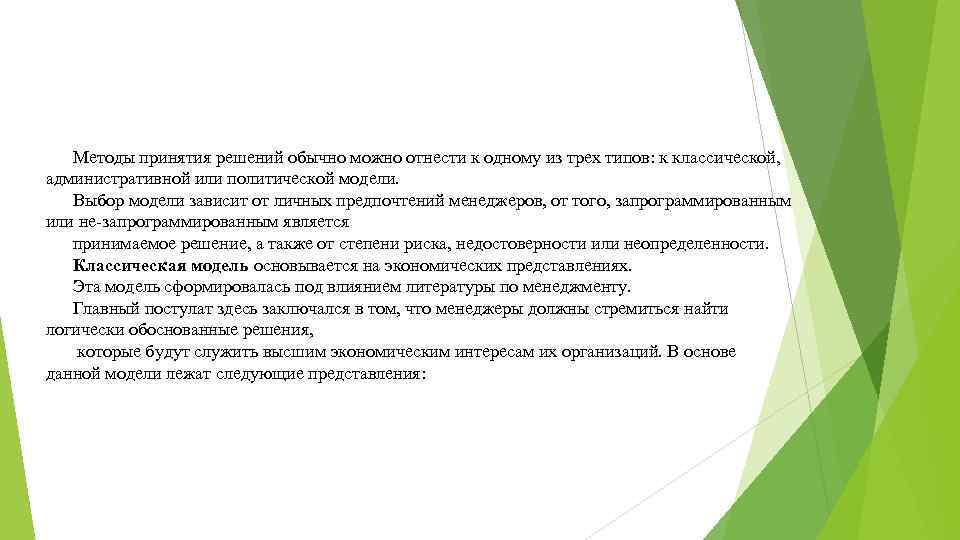 Методы принятия решений обычно можно отнести к одному из трех типов: к классической, административной или политической модели. Выбор модели зависит от личных предпочтений менеджеров, от того, запрограммированным или не-запрограммированным является принимаемое решение, а также от степени риска, недостоверности или неопределенности. Классическая модель основывается на экономических представлениях. Эта модель сформировалась под влиянием литературы по менеджменту. Главный постулат здесь заключался в том, что менеджеры должны стремиться найти логически обоснованные решения, которые будут служить высшим экономическим интересам их организаций. В основе данной модели лежат следующие представления: