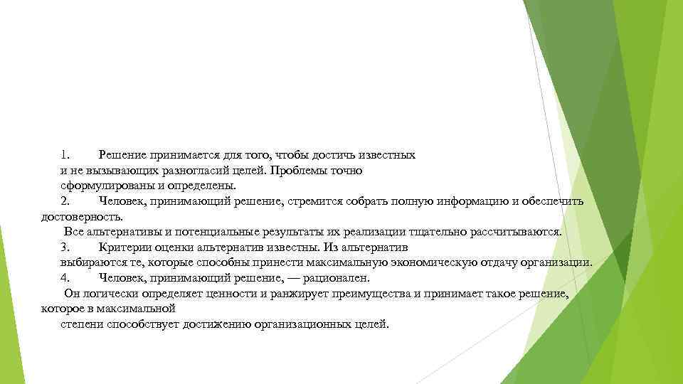 1. Решение принимается для того, чтобы достичь известных и не вызывающих разногласий целей. Проблемы точно сформулированы и определены. 2. Человек, принимающий решение, стремится собрать полную информацию и обеспечить достоверность. Все альтернативы и потенциальные результаты их реализации тщательно рассчитываются. 3. Критерии оценки альтернатив известны. Из альтернатив выбираются те, которые способны принести максимальную экономическую отдачу организации. 4. Человек, принимающий решение, — рационален. Он логически определяет ценности и ранжирует преимущества и принимает такое решение, которое в максимальной степени способствует достижению организационных целей.