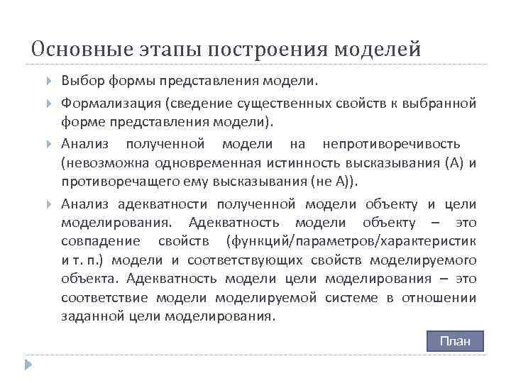 Основные этапы построения моделей Выбор формы представления модели. Формализация (сведение существенных свойств к выбранной форме представления модели). Анализ полученной модели на непротиворечивость (невозможна одновременная истинность высказывания (А) и противоречащего ему высказывания (не А)). Анализ адекватности полученной модели объекту и цели моделирования. Адекватность модели объекту – это совпадение свойств (функций/параметров/характеристик и т. п. ) модели и соответствующих свойств моделируемого объекта. Адекватность модели цели моделирования – это соответствие моделируемой системе в отношении заданной цели моделирования. План