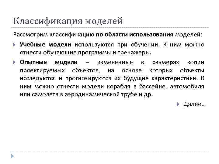 Классификация моделей Рассмотрим классификацию по области использования моделей: Учебные модели используются при обучении. К ним можно отнести обучающие программы и тренажеры. Опытные модели – измененные в размерах копии проектируемых объектов, на основе которых объекты исследуются и прогнозируются их будущие характеристики. К ним можно отнести модели корабля в бассейне, автомобиля или самолета в аэродинамической трубе и др. Далее…