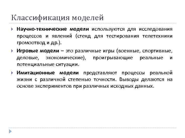Классификация моделей Научно-технические модели используются для исследования процессов и явлений (стенд для тестирования телетехники громоотвод и др. ). Игровые модели – это различные игры (военные, спортивные, деловые, экономические), проигрывающие реальные и потенциальные ситуации. Имитационные модели представляют процессы реальной жизни с различной степенью точности. Выводы делаются на основе экспериментов при различных исходных данных.