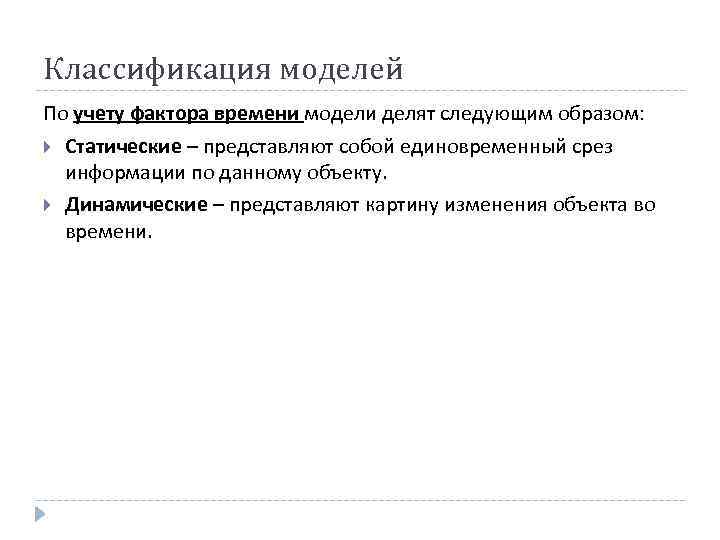 Классификация моделей По учету фактора времени модели делят следующим образом: Статические – представляют собой единовременный срез информации по данному объекту. Динамические – представляют картину изменения объекта во времени.