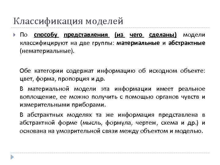 Классификация моделей По способу представления (из чего сделаны) модели классифицируют на две группы: материальные и абстрактные (нематериальные). Обе категории содержат информацию об исходном объекте: цвет, форма, пропорция и др. В материальной модели эта информации имеет реальное воплощение, ее можно получить с помощью органов чувств и измерительными приборами. В абстрактных моделях та же информация представлена в абстрактной форме (мысль, формула, чертеж, схема и др. ) и основана на умозрительной связи между объектом и моделью.