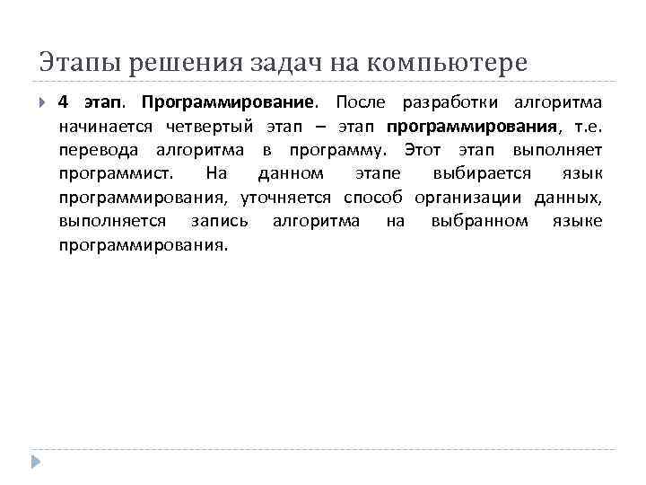 Этапы решения задач на компьютере 4 этап. Программирование. После разработки алгоритма начинается четвертый этап – этап программирования, т. е. перевода алгоритма в программу. Этот этап выполняет программист. На данном этапе выбирается язык программирования, уточняется способ организации данных, выполняется запись алгоритма на выбранном языке программирования.