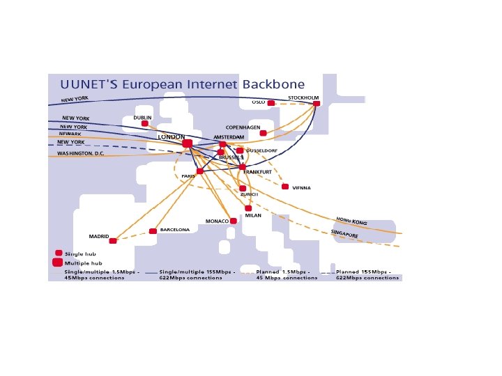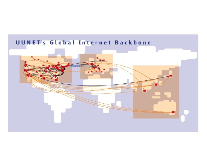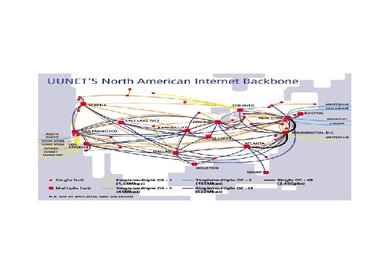Internet Physical Infrastructure ISP Residential Access – – Modem DSL Cable modem Satellite Backbone Enterprise/ISP access, Backbone transmission ISP Campus network – Ethernet, ATM Internet Service Providers – – T 1/T 3, DS-1 DS-3 OC-3, OC-12 – ATM vs. SONET, vs. WDM – – – access, regional, backbone Point of Presence (POP) Network Access Point (NAP)