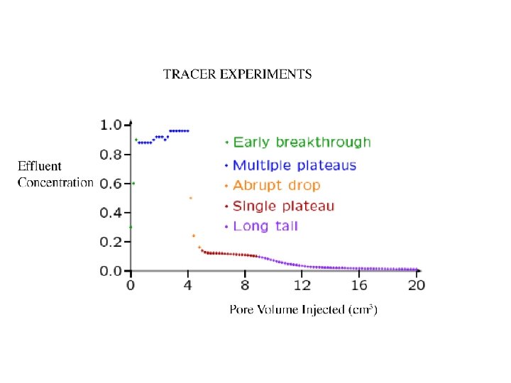 HEURISTIC ARGUMENTS USING STOKES FLOW: causes for marker behaviour • Early Breakthrough: Tracer finds a pathway through the network • Multiple Plateaus: Tracer finds other (longer) ways through the network – result: new plateaus whenever a new way opens. • Abrupt Drop: Time drop correlated to end of injection. A time delay is due to cells on the main paths, acting as tracer reservoirs for a small amount of time. • Single Plateau: Weakly interconnected vugs are drained slowly. The large main volumes of vugs act as the reservoir for a longer time, leading to a plateau of constant height until they are drained. • Long Tail: Remaining tracer in thin arms is slowly washed out after main volumes are drained – diffusive process (exponential decay). Implement model on computer: test arguments!