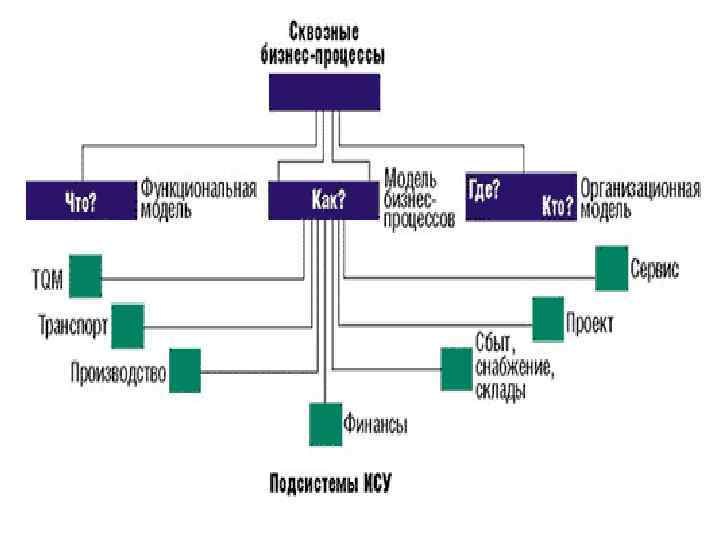 В основе бизнес-модели всегда лежат бизнес-цели предприятия, по большому счету полностью определяющие состав всех базовых компонентов бизнес-модели: • бизнес-функции, описывающие, ЧТО делает бизнес; • бизнес-процессы, описывающие, КАК предприятие выполняет свои бизнес-функции; • организационная структура, определяющая, ГДЕ исполняются бизнес-функции и бизнес-процессы; • фазы, определяющие, КОГДА (в какой последовательности) должны быть внедрены те или иные бизнес-функции; • роли, определяющие, КТО исполняет бизнес-процессы; • правила, определяющие связь между ЧТО, КАК, ГДЕ, КОГДА и КТО.