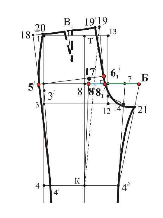 • Для фигур с широкими бёдрами и очень плоскими ягодицами при построении брюк требуется значительное уменьшение значения ширины шага • 8/ 81/ = 0, 25 Шзп + (1, 0 1, 5 см) • Это даёт уменьшение ширины шага задней половинки брюк на 2, 0 3, 0 см по сравнению с типовой конструкцией Дополнительные меры К _ 19 = К _ 18 – 1, 0 см 8 _ 8/ = 2, 0 см (в типовой конструкции 1, 5 см)