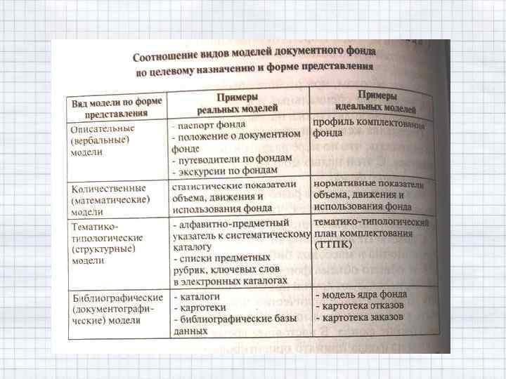 Виды моделей документного фонда: 1. по целевому назначению: 1. 1. реальные (модели-копии); 1. 2. идеальные (прогностические модели, модели-образцы).