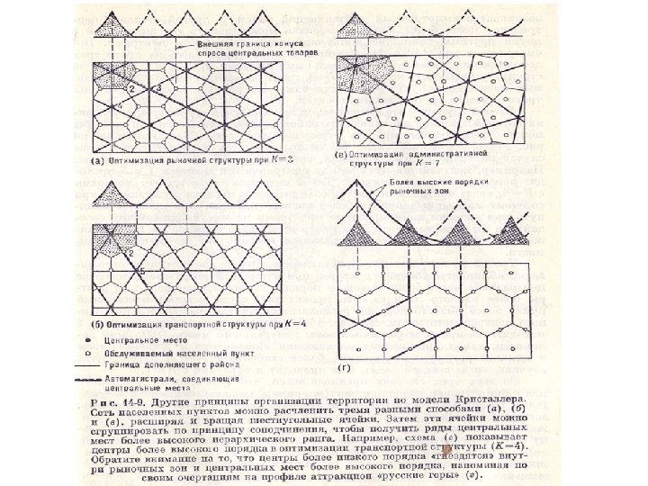 Теория центральных мест: варианты оптимизации n n n Оптимизация рыночной структуры (К=3) Оптимизация транспортной структуры (К=4) Оптимизация административной структуры (К=7)
