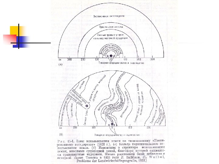 Модель фон Тюнена n n n n (1830 -е годы) Исходные допущения Однородная равнина с городом в центре Равнина – сельское хозяйство, город – рынок Одинаковое плодородие + изотропность Отсутствие эффекта масштаба (равный размер земельных участков) Одинаковые издержки производства Расстояние равнозначно объёму продукции