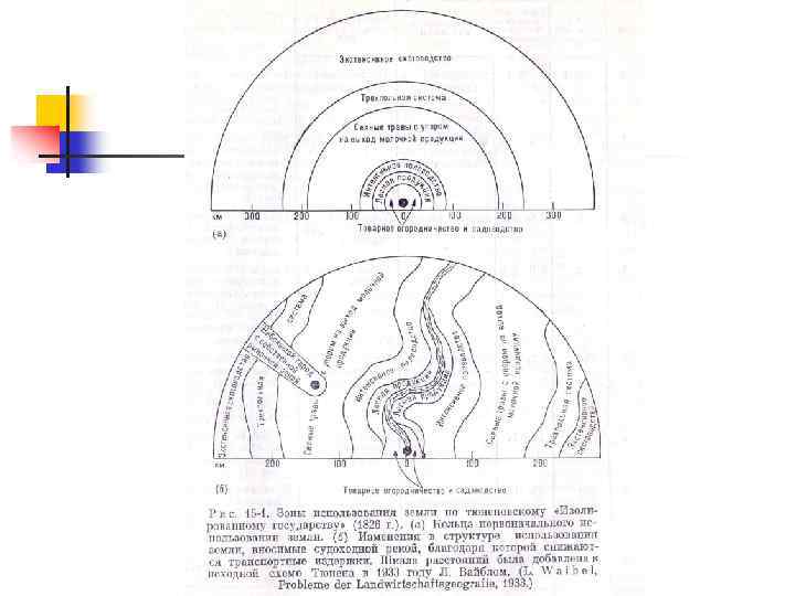 Модель фон Тюнена n n n n (1830 -е годы) Исходные допущения Однородная равнина с городом в центре Равнина – сельское хозяйство, город – рынок Одинаковое плодородие + изотропность Отсутствие эффекта масштаба (равный размер земельных участков) Одинаковые издержки производства Расстояние равнозначно объёму продукции