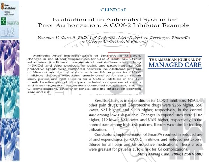 Resultados (1) 1. Estudios publicados= 15 2. Muy recientes: 60% > 2003 3. Principales medicamentos: 1. 2. AINEs y COXIBs (11) IBP(2), antibióticos(1), med. cardiovasculares(1) 4. Países 1. 2. 13/15 USA (Medicaid) - 2/15 Canadá e Israel Existen experiencias no publicadas en Dinamarca, Noruega, Francia y España.
