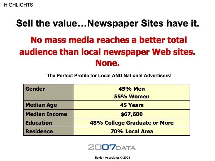 Overall Implications for Newspapers • Readership of the core printed paper is likely to continue to decline • The daily printed product may no longer be the core product for some advertisers • Develop targeted niche products and specialty Web sites • Position newspapers as part of a multi-media buy • Leverage local brand, local news, local relationships – because nobody can “do local” like the newspaper