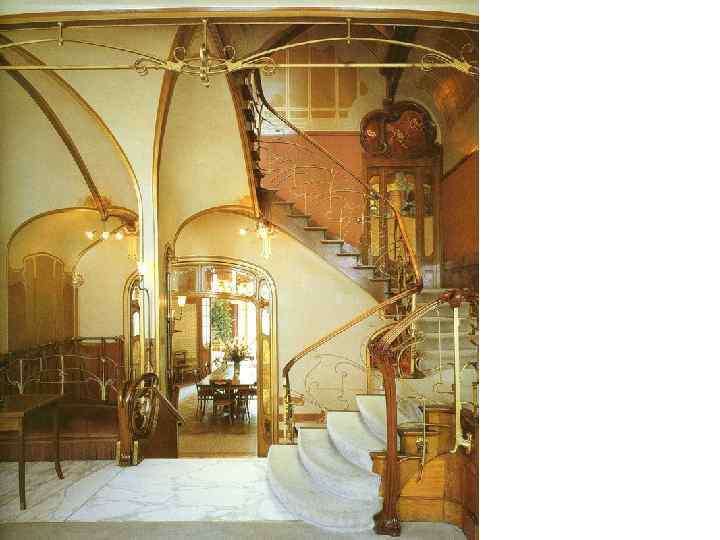 Дом Тасселя (Брюссель) архитектор В. Орта. Структура дома подчиняется асимметричному пространству холла и лестницы. Открытый металлический каркас основа конструктивной и орнаментальной системы. Виктор Орта, лестница в особняке "Тасселя", 1892 -1893
