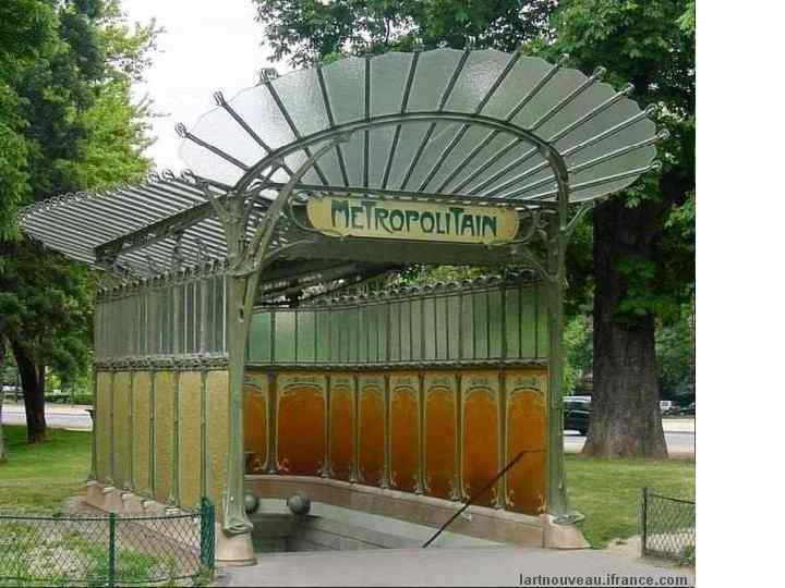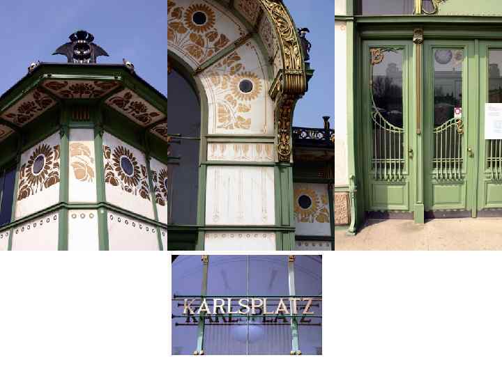 Отто Вагнер. Станция городской железной дороги. Структуру определяет тонкий металлический каркас, в которой сочетаются криволинейные и прямолинейные элементы, образуя намек на тему триумфальных ворот. Каркас заполнен мраморными панелями, на которые нанесен флоральный орнамент.