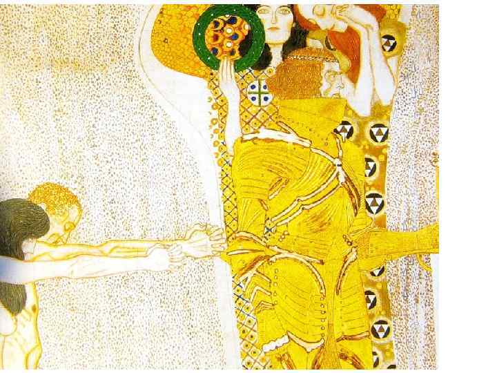 Климт воплотил в своей фреске художественное изображение Девятой симфонии Бетховена. Работа была создана в 1902 году специально к Бетховенской выставке. Левая композиция «Тоска по счастью» изображала золотого рыцаря, идущего на борьбу с силами зла, его провожали две женские фигуры символизирующие Победу (Славу) с венком победителя и Сострадание. Центральная композиция «Враждебные силы» представляет собой силы зла. Состоит из нескольких деталей: центральная огромная фигура Трифона, слева от него три горгоны, символизирующие болезнь, безумие и смерть, справа женские фигуры символизирующие сладострастие, несдержанность и похоть.