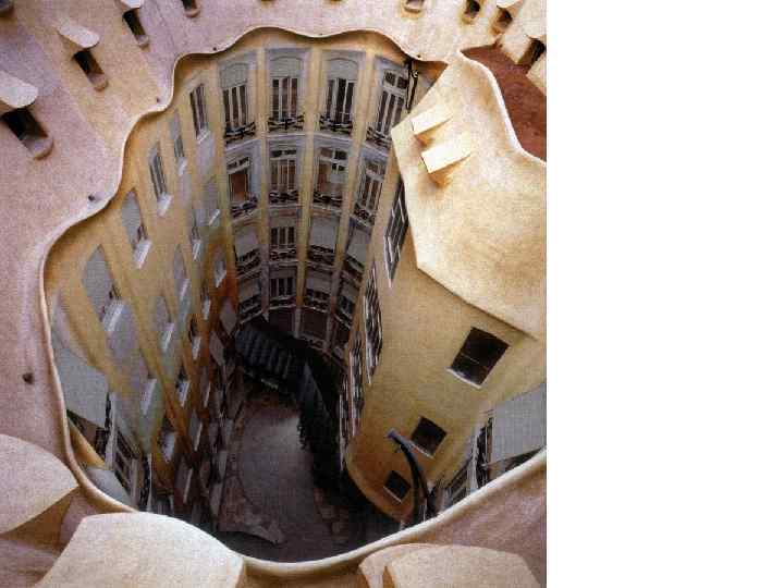 Дом Мила (Барселона) массивен, тяжеловесен. План организован вокруг 2 внутренних дворов, тоже криволинейно очерченных. Фасады подчинены волнообразной вибрации по вертикали и по горизонтали. Здание производит впечатление рукотворной горы. Проемы рождают ассоциации с пещерами. В местном просторечии дом называют «каменоломня» . Антонио Гауди