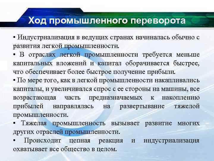 Ход промышленного переворота • Индустриализация в ведущих странах начиналась обычно с развития легкой промышленности. • В отраслях легкой промышленности требуется меньше капитальных вложений и капитал оборачивается быстрее, что обеспечивает более быстрое получение прибыли. • По мере того, как в легкой промышленности накапливались капиталы, и увеличивался спрос с ее стороны на машины, все возрастающая часть предназначаемых к накоплению прибылей направлялась на развертывание тяжелой промышленности. • Тяжелая промышленность вызывает развитие многих других отраслей промышленности. • Происходит цепная реакция и индустриализация охватывает все общество в целом.