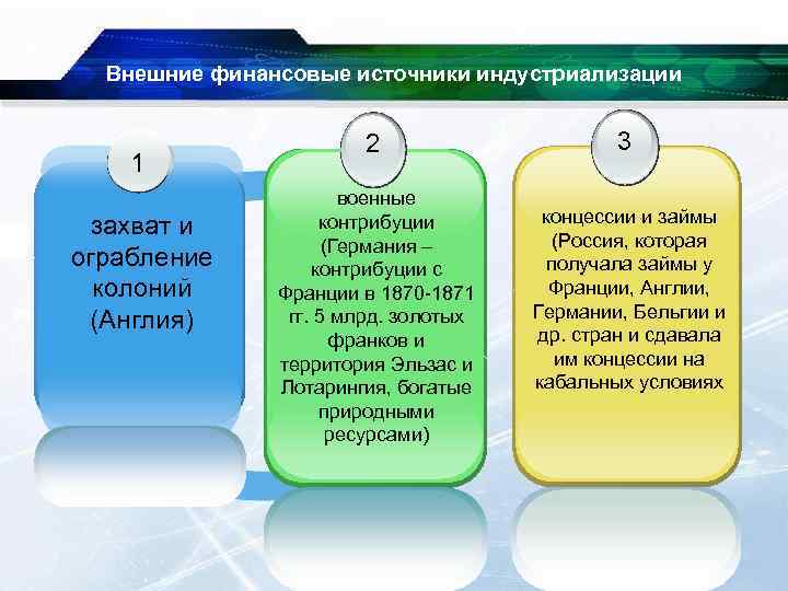 Внешние финансовые источники индустриализации 1 захват и ограбление колоний (Англия) 2 военные контрибуции (Германия – контрибуции с Франции в 1870 -1871 гг. 5 млрд. золотых франков и территория Эльзас и Лотарингия, богатые природными ресурсами) 3 концессии и займы (Россия, которая получала займы у Франции, Англии, Германии, Бельгии и др. стран и сдавала им концессии на кабальных условиях