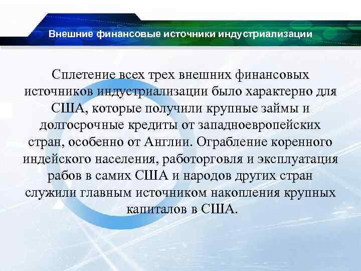 Внешние финансовые источники индустриализации Сплетение всех трех внешних финансовых источников индустриализации было характерно для США, которые получили крупные займы и долгосрочные кредиты от западноевропейских стран, особенно от Англии. Ограбление коренного индейского населения, работорговля и эксплуатация рабов в самих США и народов других стран служили главным источником накопления крупных капиталов в США.