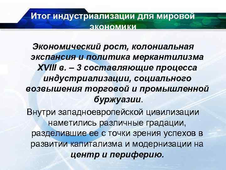 Итог индустриализации для мировой экономики Экономический рост, колониальная экспансия и политика меркантилизма XVIII в. – 3 составляющие процесса индустриализации, социального возвышения торговой и промышленной буржуазии. Внутри западноевропейской цивилизации наметились различные градации, разделившие ее с точки зрения успехов в развитии капитализма и модернизации на центр и периферию.