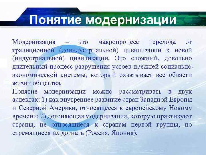 Понятие модернизации Модернизация – это макропроцесс перехода от традиционной (доиндустриальной) цивилизации к новой (индустриальной) цивилизации. Это сложный, довольно длительный процесс разрушения устоев прежней социальноэкономической системы, который охватывает все области жизни общества. Понятие модернизации можно рассматривать в двух аспектах: 1) как внутреннее развитие стран Западной Европы и Северной Америки, относящееся к европейскому Новому времени; 2) догоняющая модернизация, которую практикуют страны, не относящиеся к странам первой группы, но стремящиеся их догнать (Россия, Япония).