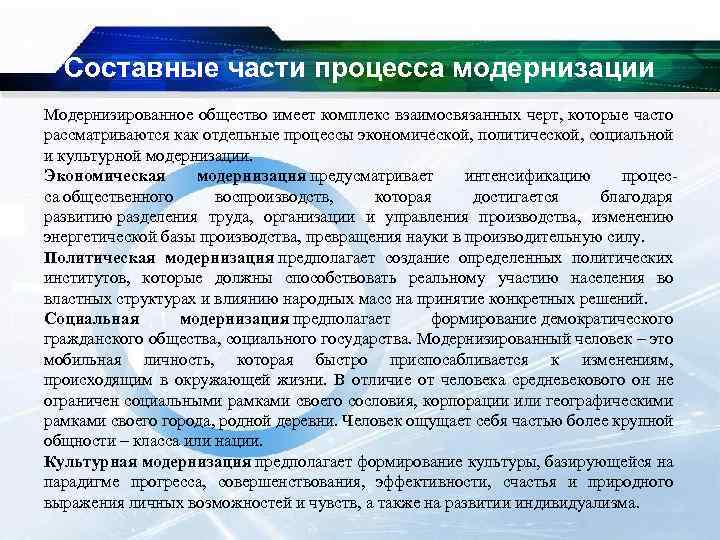 Составные части процесса модернизации Модернизированное общество имеет комплекс взаимосвязанных черт, которые часто рассматриваются как отдельные процессы экономической, политической, социальной и культурной модернизации. Экономическая модернизация предусматривает интенсификацию процесса общественного воспроизводств, которая достигается благодаря развитию разделения труда, организации и управления производства, изменению энергетической базы производства, превращения науки в производительную силу. Политическая модернизация предполагает создание определенных политических институтов, которые должны способствовать реальному участию населения во властных структурах и влиянию народных масс на принятие конкретных решений. Социальная модернизация предполагает формирование демократического гражданского общества, социального государства. Модернизированный человек – это мобильная личность, которая быстро приспосабливается к изменениям, происходящим в окружающей жизни. В отличие от человека средневекового он не ограничен социальными рамками своего сословия, корпорации или географическими рамками своего города, родной деревни. Человек ощущает себя частью более крупной общности – класса или нации. Культурная модернизация предполагает формирование культуры, базирующейся на парадигме прогресса, совершенствования, эффективности, счастья и природного выражения личных возможностей и чувств, а также на развитии индивидуализма.