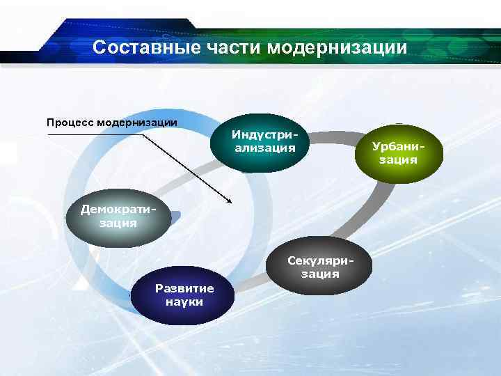 Составные части модернизации Процесс модернизации Индустриализация Демократизация Секуляризация Развитие науки Урбанизация