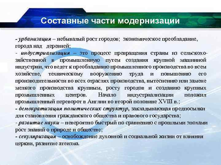 Составные части модернизации - урбанизация – небывалый рост городов; экономическое преобладание, города над деревней; - индустриализация – это процесс превращения страны из сельскохозяйственной в промышленную путем создания крупной машинной индустрии, что ведет к преобладанию промышленного производства во всем хозяйстве, техническому вооружению труда и повышению его производительности во всех отраслях производства, вытеснению или замене мелкого производства крупным, росту городов и созданию крупных промышленных центров. Начало индустриализации положил промышленный переворот в Англии во второй половине XVIII в. ; - демократизация политических структур, закладывающая предпосылки для становления гражданского общества и правового государства; - развитие науки – невероятно быстрый по сравнению с прошлыми эпохами рост знаний о природе и обществе; - секуляризация – освобождение духовной и социальной жизни от влияния церкви, развитие атеизма.