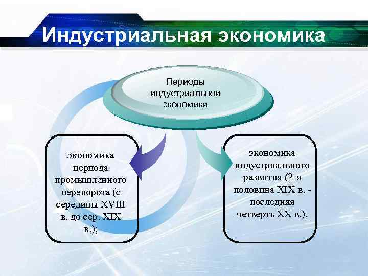 Индустриальная экономика Периоды индустриальной экономики экономика периода промышленного переворота (с середины XVIII в. до сер. ХIХ в. ); экономика индустриального развития (2 -я половина XIX в. - последняя четверть XX в. ).