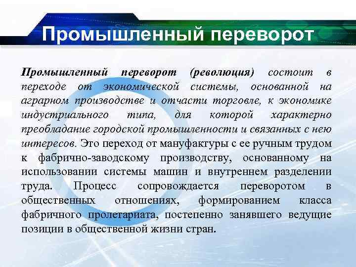 Промышленный переворот (революция) состоит в переходе от экономической системы, основанной на аграрном производстве и отчасти торговле, к экономике индустриального типа, для которой характерно преобладание городской промышленности и связанных с нею интересов. Это переход от мануфактуры с ее ручным трудом к фабрично-заводскому производству, основанному на использовании системы машин и внутреннем разделении труда. Процесс сопровождается переворотом в общественных отношениях, формированием класса фабричного пролетариата, постепенно занявшего ведущие позиции в общественной жизни стран.