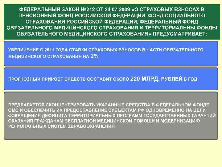 Увеличение размера страховых взносов на ОМС на 2% составит в 2011 и 2012 годах 460 млрд. рублей Весь прирост финансовых средств будет направлен на стратегические цели - реализацию программ модернизации здравоохранения Дефицит финансового обеспечения территориальных программ государственных гарантий (текущее финансирование бесплатной для граждан медицинской помощи) только в 2009 году составил около 385 млрд. рублей и по предварительной оценке в 2010 году ситуация не улучшилась РИСК: возможно еще более значительное невыполнение социальных обязательств по реализации конституционных прав граждан на бесплатную медицинскую помощь