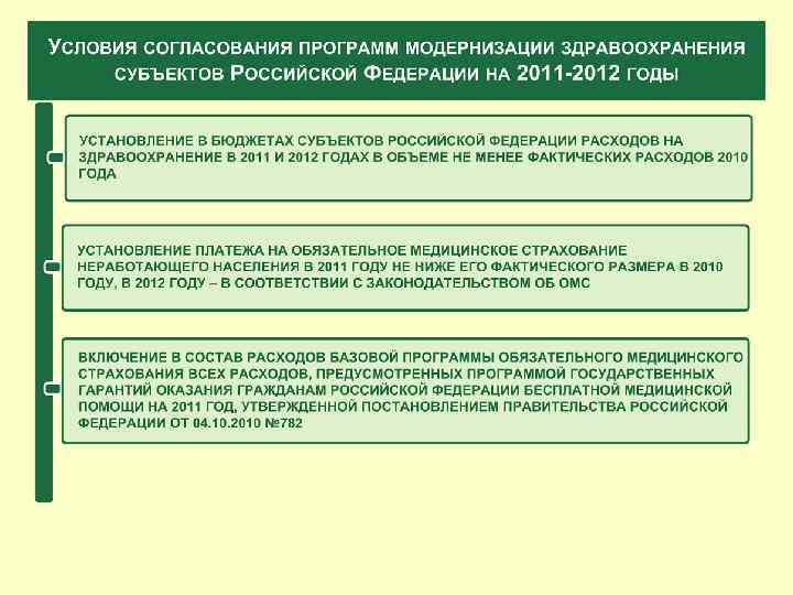 Особенности Программы государственных гарантий на 2011 год (Постановление Правительства РФ от 4 октября 2010 года № 782): Реализация территориальных программ государственных гарантий в условиях модернизации системы здравоохранения, внедрения порядков и стандартов оказания медицинской помощи Увеличение норматива объема амбулаторной медицинской помощи с 9, 5 до 9, 7 посещений в расчете на жителя в год Включение в базовую программу ОМС объема амбулаторной медицинской помощи, оказываемой в центрах планирования семьи, врачебно-физкультурных диспансерах Оказание медицинской помощи в условиях санаториев за счет средств обязательного медицинского страхования