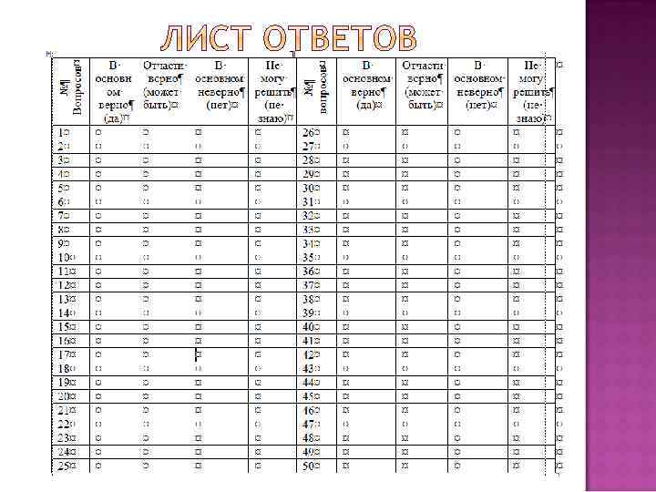 Это задание поможет вам выяснить, насколько творческой личностью вы себя считаете. Среди следующих коротких предложений вы найдете такие, которые определенно подходят вам лучше, чем другие. Их следует отметить знаком «X» в колонке «В основном верно» . Некоторые предложения подходят вам лишь частично, их следует пометить знаком «X» в колонке «Отчасти верно» . Другие ут ерждения не подойдут вам совсем, их нужно пометить знаком «X» в колонке «В основном неверно» . Те утверждения, относительно которых вы не можете придти к решению, нужно пометить знаком «X» в колонке «Не могу решить» .