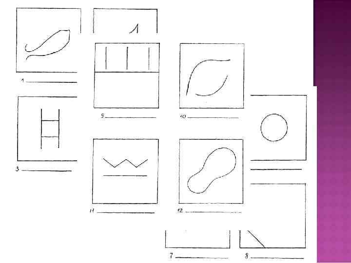 Это задание поможет узнать, насколько ребенок способен к творческому самовыражению с помощью рисунков. Предлагается 12 рисунков. На листе нарисованы незаконченные фигуры. Если добавить к ним дополнительные линии, могут получиться интересные предметы или истории. Нужно нарисовать такие картинки, которые бы не смог придумать никто другой. Придумать интересное название для каждого рисунка и напиши его снизу. На выполнение задания отводится 25 минут.